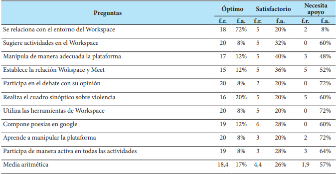 Los datos generales obtenidos de los indicadores que toman en cuenta el trabajo con el Wokspace, hace referencia a un cambio sustancial en cuanto al trabajo desarrollado por los estudiantes participantes en el manejo de esta plataforma y al mismo tiempo en los contenidos desarrollados en el área de Comunicación y Lenguaje, donde el 74% de los participantes se encuentran en un nivel Óptimo y al responder a las actividades han mostrado una mejoría sustancial; por otro lado el 18% de los estudiantes se encuentran en un nivel Satisfactorio de acuerdo a las actividades desarrolladas. Finalmente, el 8% de los participantes aún no han podido comprender la funcionalidad del Workspace.