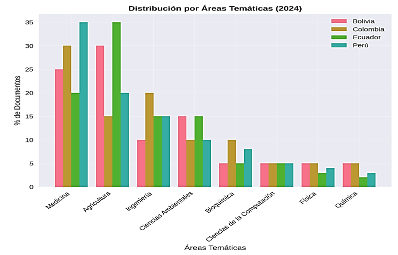 Predominant thematic areas include medicine, agriculture, engineering, and environmental sciences. Network analysis shows that Colombia presents the highest