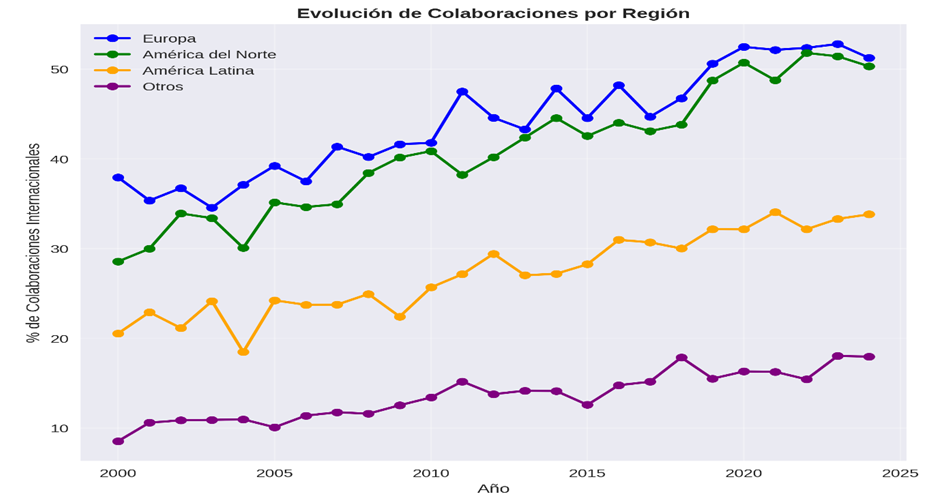production, international collaboration patterns, and co-authorship network structure. Results reveal exponential growth in regional scientific production, with Colombia and