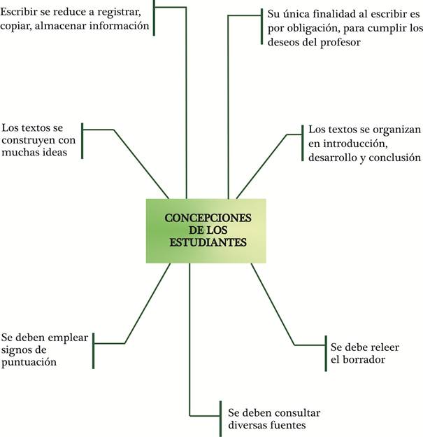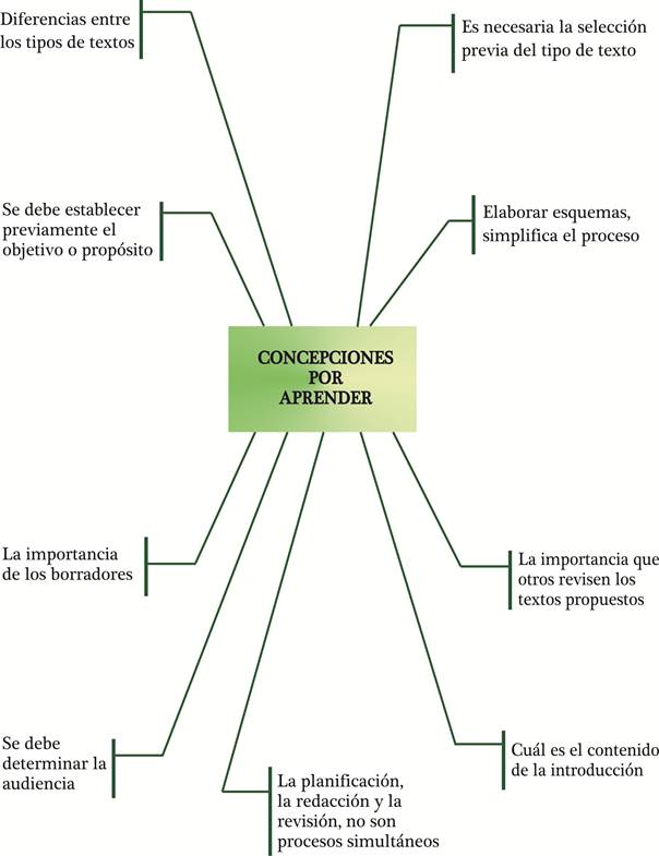 Los resultados anteriores demuestran, después de un minucioso análisis y para dar respuestas al primer objetivo de esta investigación, que se pudo determinar cuáles son las concepciones que tienen los alumnos universitarios sobre el proceso de composición escrita, las cuales se detallan en la Figura 1: