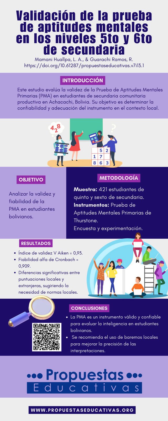 El presente estudio examina el grado de validez de la Prueba de Aptitudes Mentales Primarias (PMA) en las unidades educativas de la ciudad intermedia de Achacachi, en los grados quinto y sexto de secundaria comunitaria productiva. La población de estudio está compuesta por 421 estudiantes. El enfoque es cuantitativo, el diseño no experimental, descriptivo y explicativo. La técnica empleada fue la encuesta y la experimentación y el instrumento utilizado fue la Prueba de Aptitudes Mentales Primarias de Thurstone. Los resultados demostraron buenos índices de validez con la obtención de la V Aiken de 0,93 y una fiabilidad de 0,909 alfa de Cronbach, por lo tanto, el instrumento es útil para evaluar la inteligencia. También se observó una diferencia significativa entre las puntuaciones locales y extranjeras que sugiere la necesidad de utilizar normas locales para la aplicación de esta prueba, a fin de asegurar inferencias e interpretaciones correctas sobre la misma.