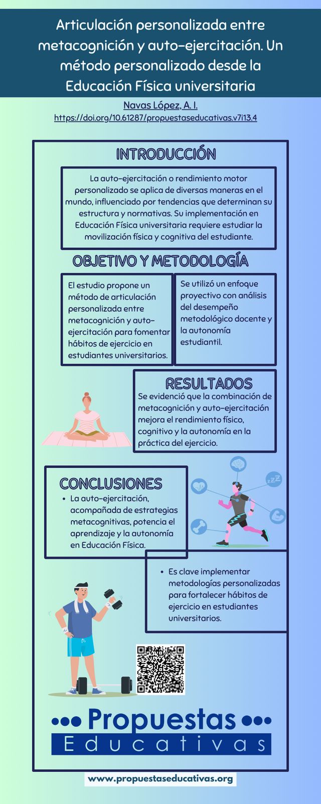 La auto-ejercitación se entiende y aplica de diversas maneras en todo el mundo. Su concepción está determinada por su estructuración, normas y procedimientos. El objetivo del presente estudio fue proponer un método de articulación personalizada entre la metacognición y la auto-ejercitación para propiciar en el estudiante universitario la formación de hábitos de la práctica de ejercicios físicos durante la clase. La metodología es mixto, con un diseño experimental. La población fue de 55 estudiantes pertenecientes al primero y segundo año de la carrera de Licenciatura en Educación Pedagogía –Psicología. Se seleccionó de forma intencional, una muestra de 30 estudiantes. El resultado constituyó un aporte para el contexto de la Educación Física universitaria, donde se destaca el desempeño metodológico del docente, el desempeño físico y cognitivo del estudiante y la autonomía para la práctica del ejercicio. Se concluyó que el estudio favorece una vía para la enseñanza de la auto-ejercitación en el estudiante universitario tomando como elemento conducente las dimensiones psicológicas, procedimental y actitudinal.